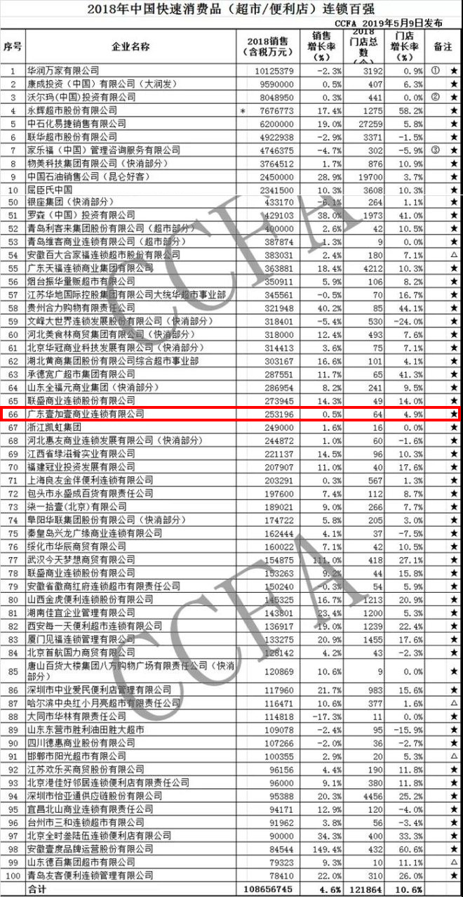 2018年中國快消品連鎖百強,是由中國連鎖經(jīng)營協(xié)會對全國快消品連鎖企業(yè)進行全方位調(diào)研、評審而做出的排名,具備權(quán)威的參考價值。目前中國連鎖協(xié)會在快消品領(lǐng)域的市場跟蹤數(shù)據(jù)已經(jīng)成為行業(yè)標準,受到眾多企業(yè)和政府部門的關(guān)注。